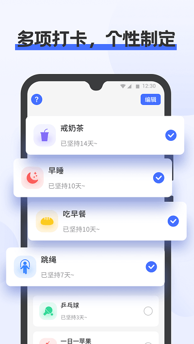 【个性打卡】可自定义创建打卡任务,如早睡、早起、学习、游泳等。帮助养成日常记录及打卡习惯。轻松运动,健康生活!