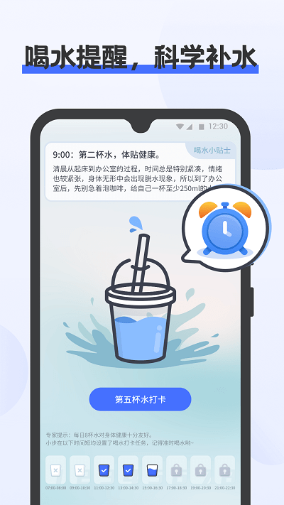 【喝水提醒】每日设定8个时间点,提醒用户及时补水,养成一天8杯水的喝水好习惯。