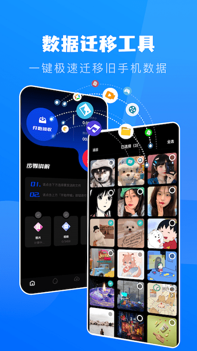 快速迁移数据,给你便捷的换机体验,让你在手机间极速互传,快速将旧手机的联系人、照片和视频等迁移到新手机,数据迁移一键轻松搞定,赶快来试试吧。
