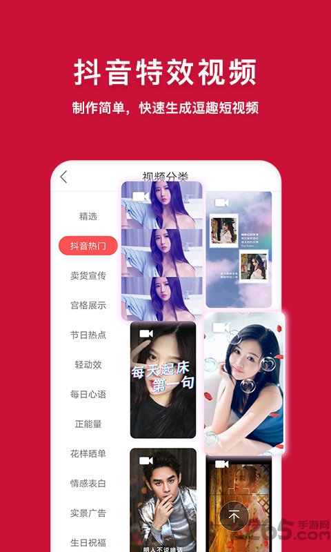 卡点视频、超清视频1080P、实景广告、网红快闪、唯美融图、创意表白、趣味搞笑……等各种创意,炫酷视频模板应有尽有、任君选择,让你享受不一样的视觉盛宴,轻松制作出跟网红一样的高颜值,高品质的视频特效。
