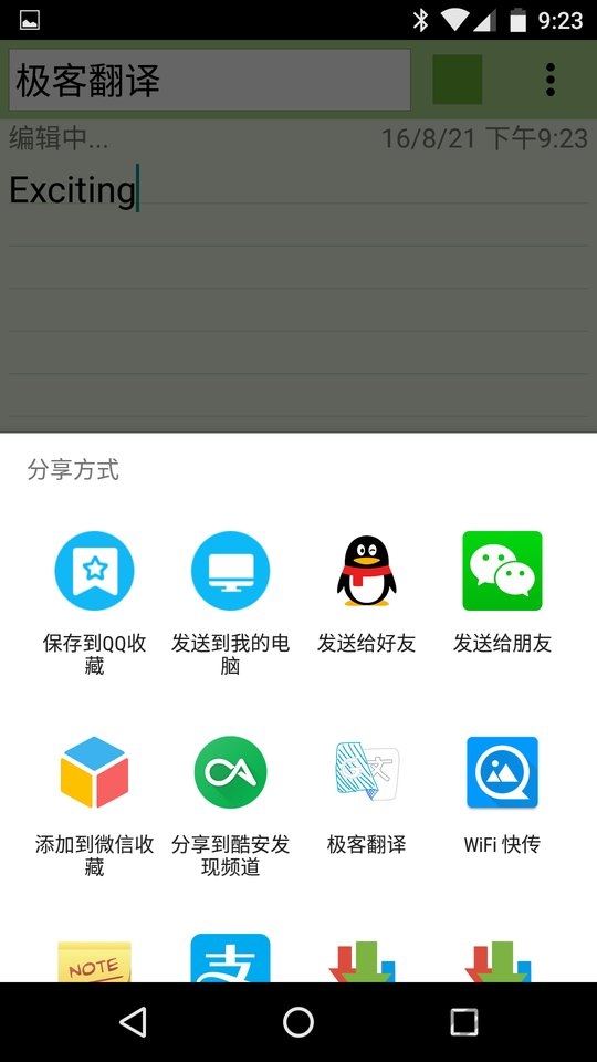 翻译方式,将文字分享到“极客翻译”。或者选中文字后,在增强剪贴板额外选项中选择“极客翻译”