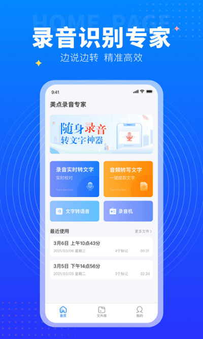 美点录音专家手机版是一款非常好用的全新录音识别工具软件,在这里能够帮助用户进行音频转换,可以帮助用户通过识别录音转换成为文字,也可以将文字转换成为音频,操作非常简单,功能也十分强大,有需要的话就来下载试试吧!