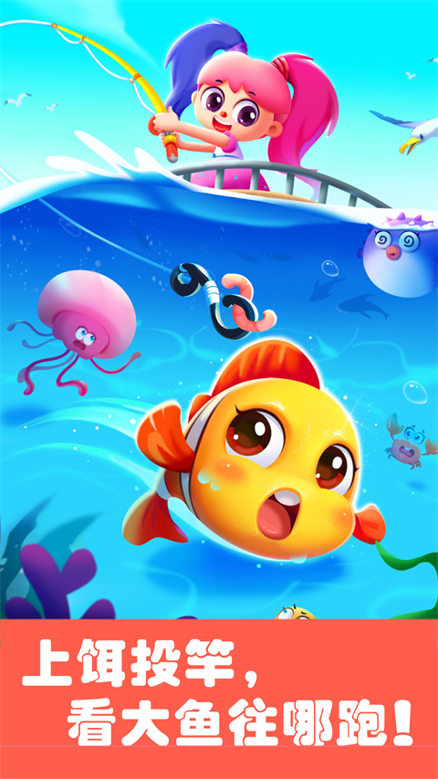 想要钓到大鱼,钓竿、饵料不可少!选购完这些物品后,开始上饵投竿啦。宝宝记得静观其变,找准时机:瞧,有小鱼聚集过来了,这时候左右移动鱼竿,定能诱鱼上钩!(培养耐力)