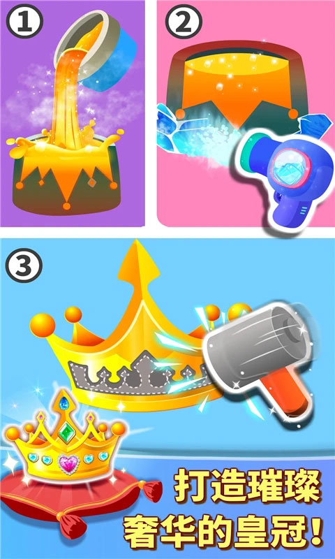 小公主怎么能缺少皇冠呢?将黄金加热浇铸成型,挑选亮闪闪的宝石、五颜六色的珍珠作点缀。皇冠做好了,给公主戴上拍照喽!