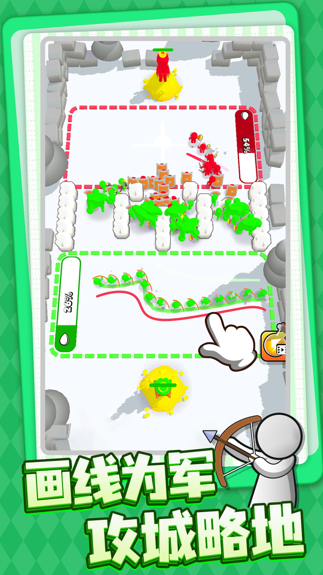 画线为军,撒豆成兵,一切都不在话下,使用神奇的墨水,画出线条,英勇的士兵将会在指尖显现,扩大版图,指挥作战,战胜潮水般的敌军,击败山岳般的boss,还有彩色独角兽,为你开启隐藏关卡,快来迎战吧。