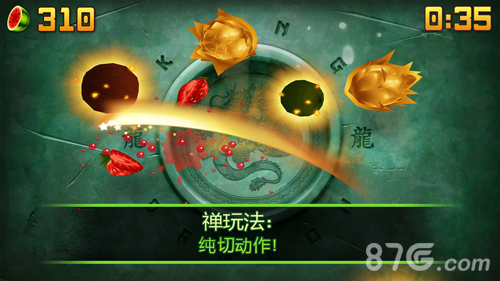 Zen:图标为苹果的Zen模式中,没有炸弹,只会不断出现水果,时间为1分半。在这一分半内谁因连击而切出的分数越高,谁就是胜利者。游戏不会因水果的掉落而失败。