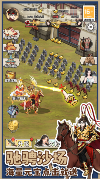 主角攻城、破城、砍小兵大将,拿下一个个城池、升级、获得美女的玩法,男人最喜欢的:战斗+美人!