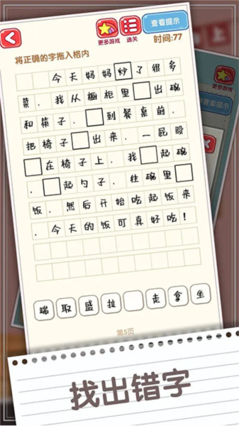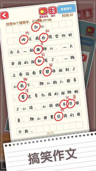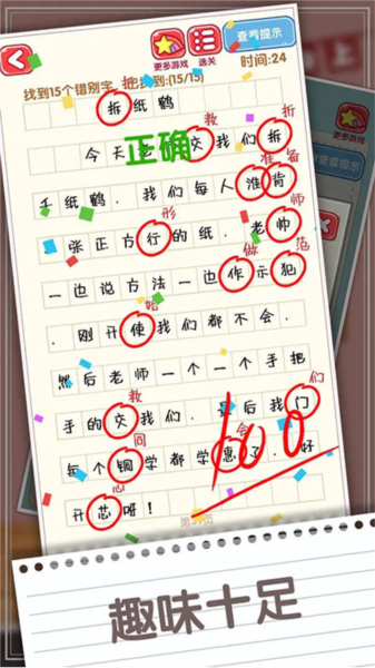 消灭错别字游戏不仅提供了一种新颖的学习方式,更是一种寓教于乐的体验。玩家在下载安装后,即可开始一场文字之旅。在每个关卡中,一篇篇精心挑选的文章等待着你去发现隐藏的错别字。时间紧迫,你需要眼疾手快,精准点击,找出那些不和谐的字词。随着关卡的深入,游戏难度逐步加大,挑战你的观察力和反应速度,同时加深你对汉字的理解。